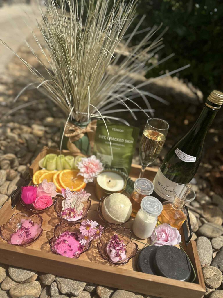 Indulge in a champagne soak with rose petals, followed by a milk and honey citrus scrub that nourishes skin and fights aging by neutralizing free radicals. Enjoy sea salt exfoliation, a collagen mask, and collagen cream, finishing with deeply moisturizing collagen socks.